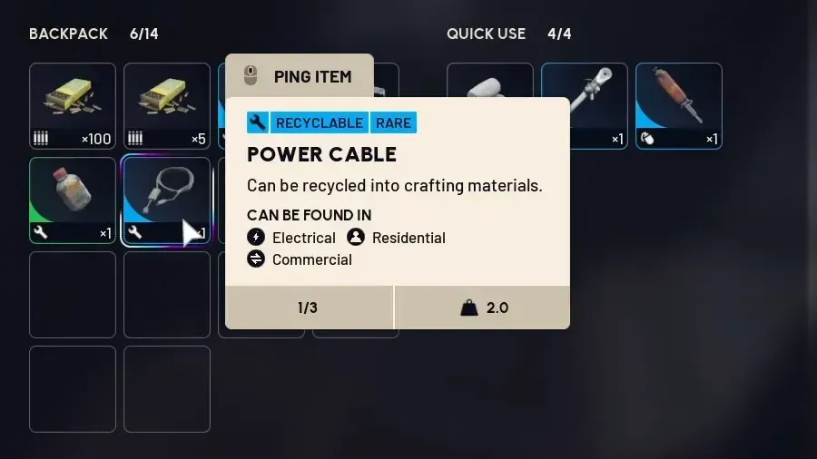 Recycle when you need wires; it yields more than salvaging. If you’re chasing early quests or blueprints that consume wires, a single Power Cable covers a meaningful chunk of the requirement.