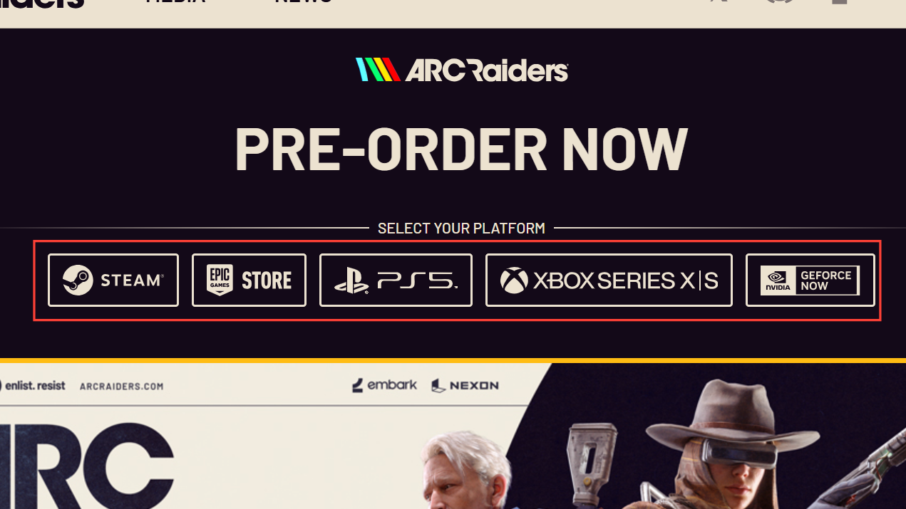 - Go to the ARC Raiders official site and pick your platform (Steam, Epic Games Store, PlayStation 5, Xbox Series X|S, or GeForce NOW).