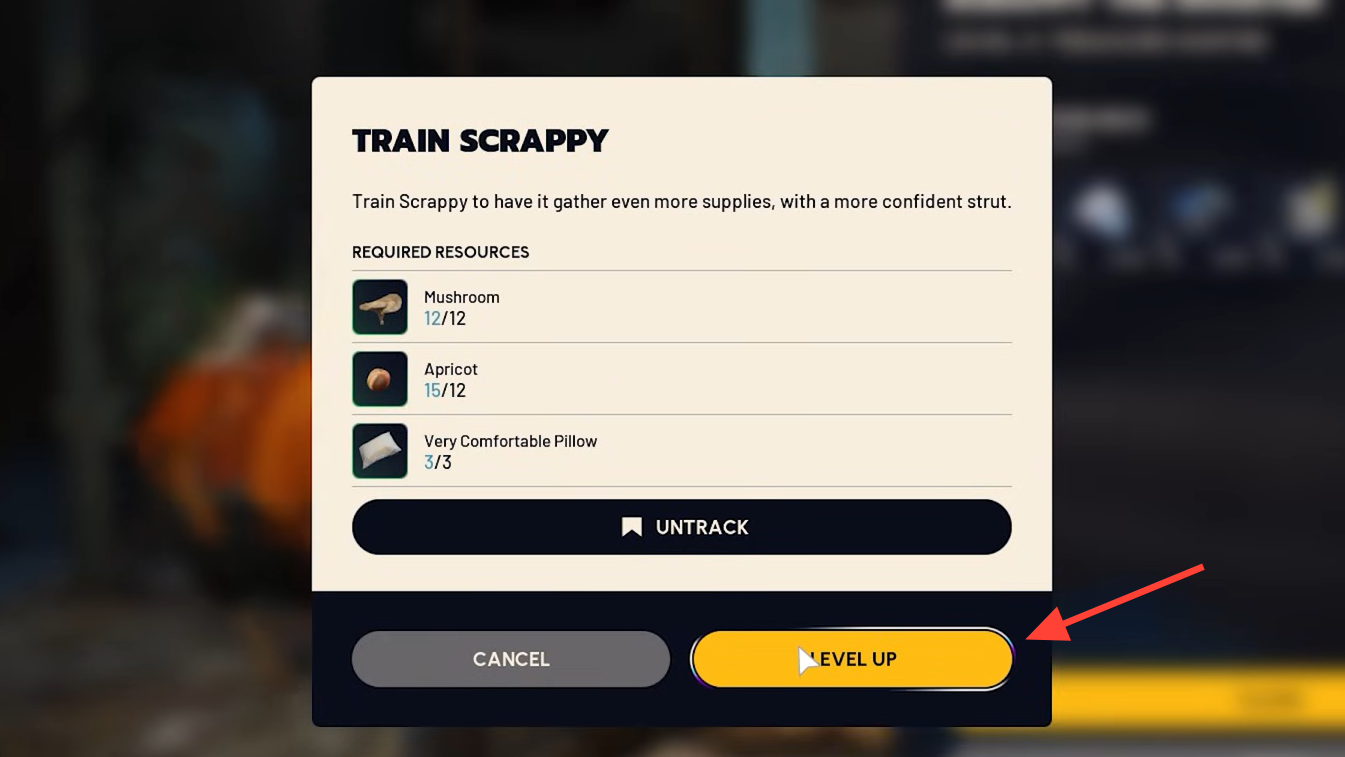 Training is handled at your Workshop. Select Scrappy, then choose Train to view and fulfill requirements tier by tier. You can’t skip levels.