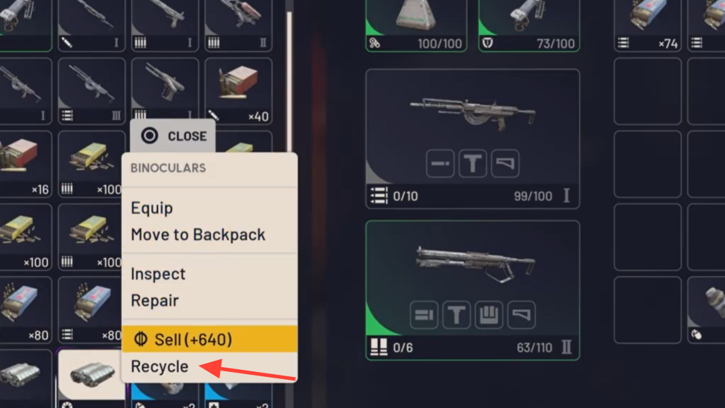 Recycling converts surplus loot into crafting components you’ll use later. You can do it from the main menu or while you’re in a session.