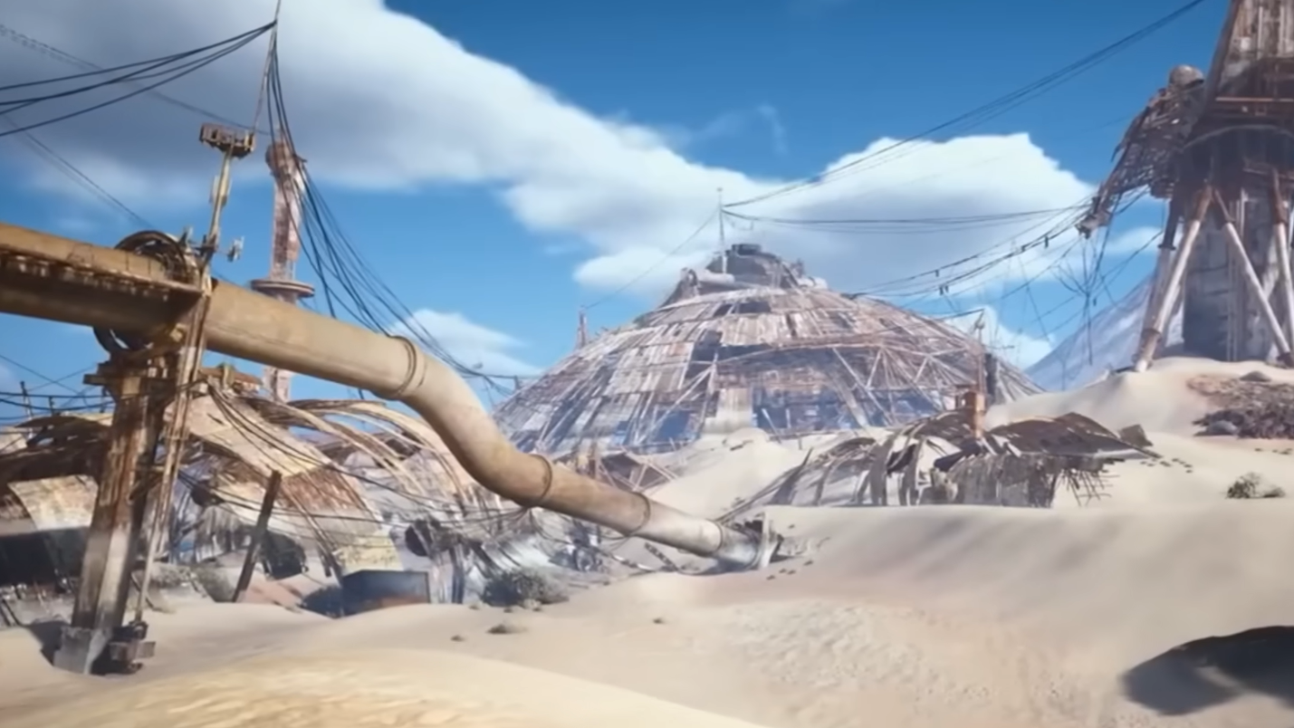 Concept art and early development imagery point to a dramatically different environment compared to existing maps. Expect sandy dunes, jagged cliffs, flooded urban ruins, and wide-open sightlines along the shoreline — a stark contrast to the tight verticality of Stella Montis. Notable landmarks spotted in concept art include a ringed coastal city that extends into the water with underground sections near the waterline, an offshore platform resembling an oil rig, and a massive rocket ship lying on its side, partially submerged. Whether all of these elements make it into the final map remains to be seen.