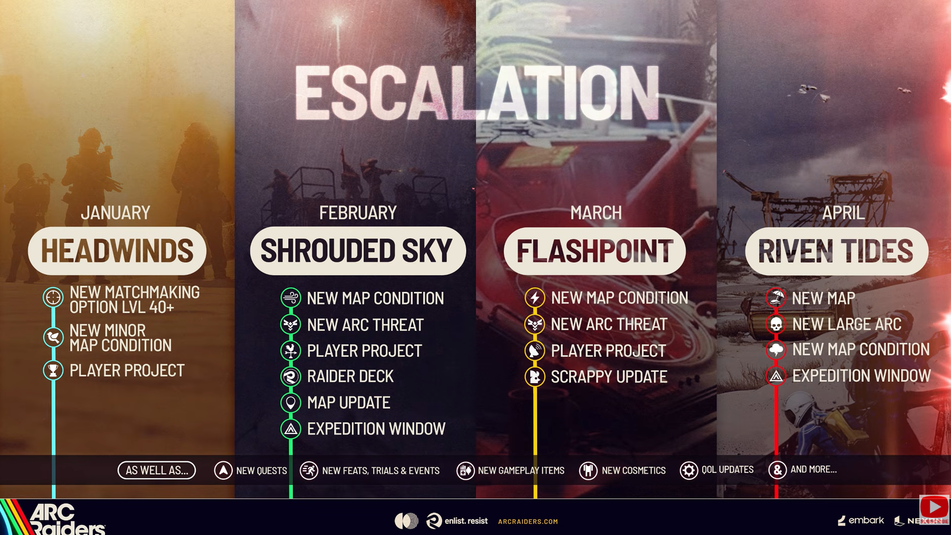 Shrouded Sky is not the update that adds a new map. That arrives in April with Riven Tides, which also introduces a new Large ARC. March's Flashpoint update sits between them, bringing another map condition, another ARC threat, a player project, and a Scrappy update. The Escalation roadmap covers January through April only; Embark has teased additional content beyond that window without specifics.