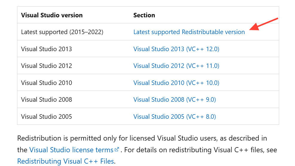 - Get the current VC++ redistributables from Microsoft’s documentation page: Latest supported Visual C++ downloads.