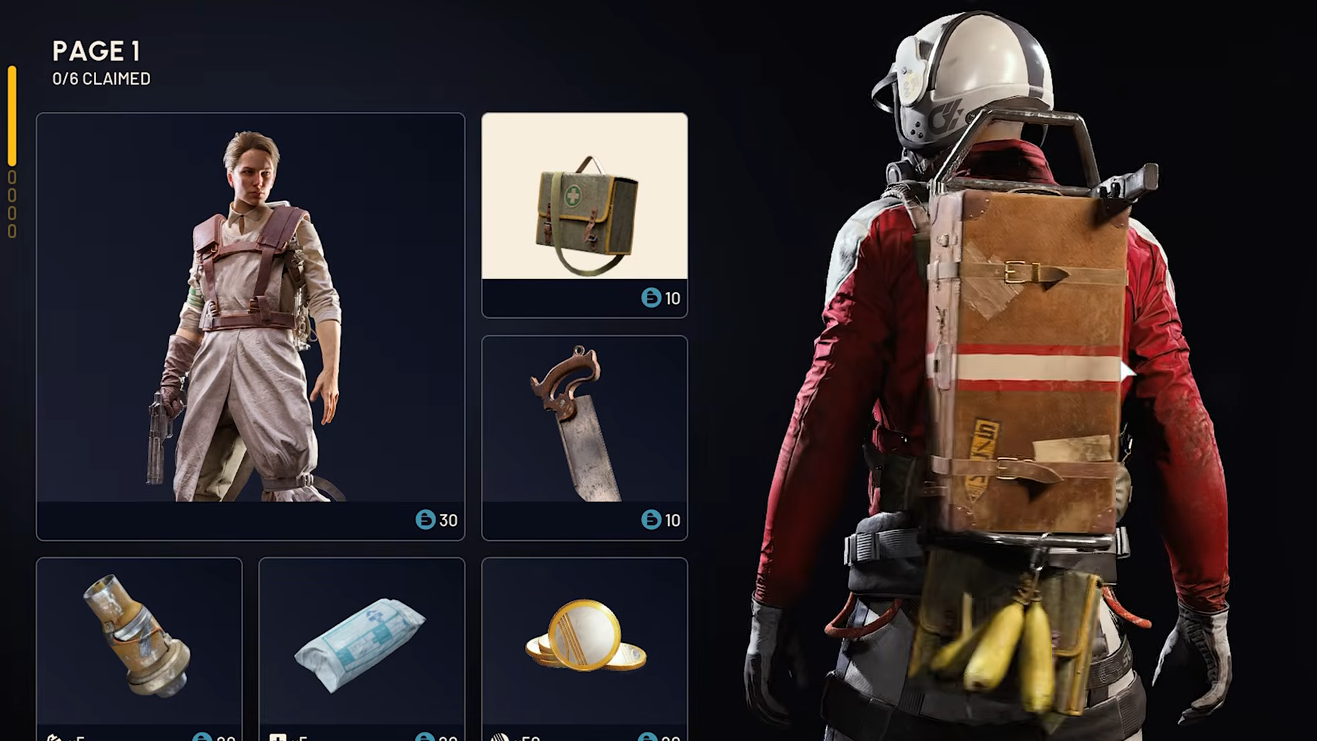 The cosmetics are the main draw. You get the base Surgeon Outfit in red on the very first page for just 30 Cred, plus multiple outfit variants and colour options (including a cyan recolour and a red variant colour) deeper in the deck. The Surgeon Hat Scrappy Outfit on page four at 90 Cred is one of the pricier individual items, but gives you a distinct headpiece that pairs well with the rest of the set.
