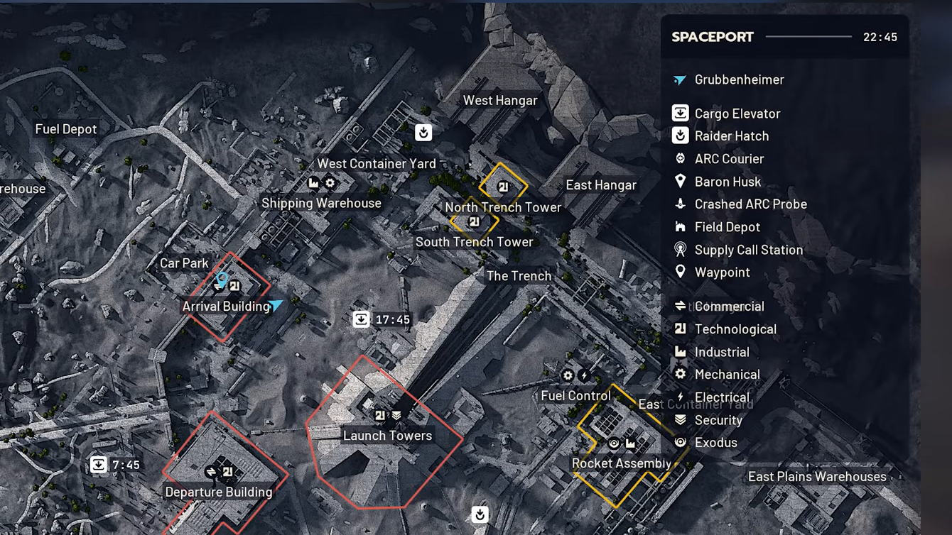 The first two objectives happen in Spaceport’s underground tunnels. These tunnels loop around the central Launch Tower area and are not shown as a separate layer on the in‑game map, so entrances are the main thing to learn.
