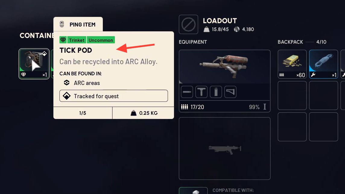 - “Tick Pod” sometimes shows up alongside trinkets even though it functions like a recyclable component. If it’s the item that breaks down into ARC Alloy, handle it as materials, not a trinket. When in doubt, check the item’s in-inventory category and recycle/sell options.