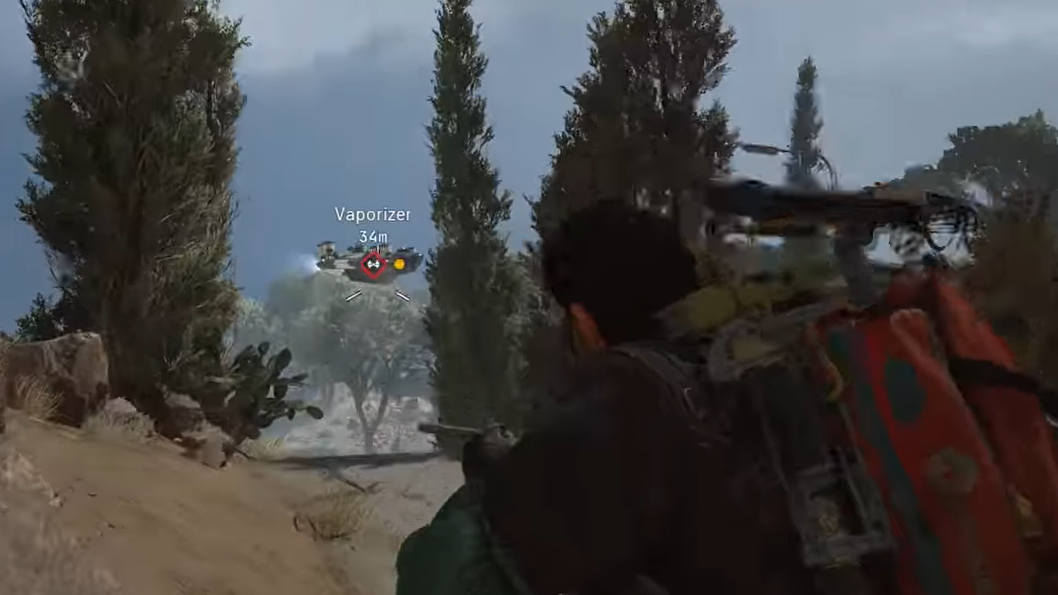 Step 2: Find a sheltered position near buildings or solid cover before engaging. You need to break the line of sight repeatedly because the Vaporizer's primary laser charges for roughly one second before firing. When you see it aim the beam, move behind cover immediately.