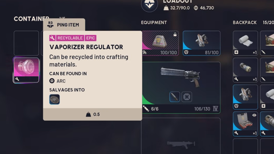 Recycling a Vaporizer Regulator yields one Advanced Electrical Component and two ARC Circuitry, while salvaging returns just two ARC Circuitry. Those returns are modest for an Epic item. Given that you need 19 Regulators for the High-Gain Antenna project alone — plus 2 more every time you craft a Dolabra — it's worth hoarding them until you've met those thresholds. Recycle or salvage only the extras.