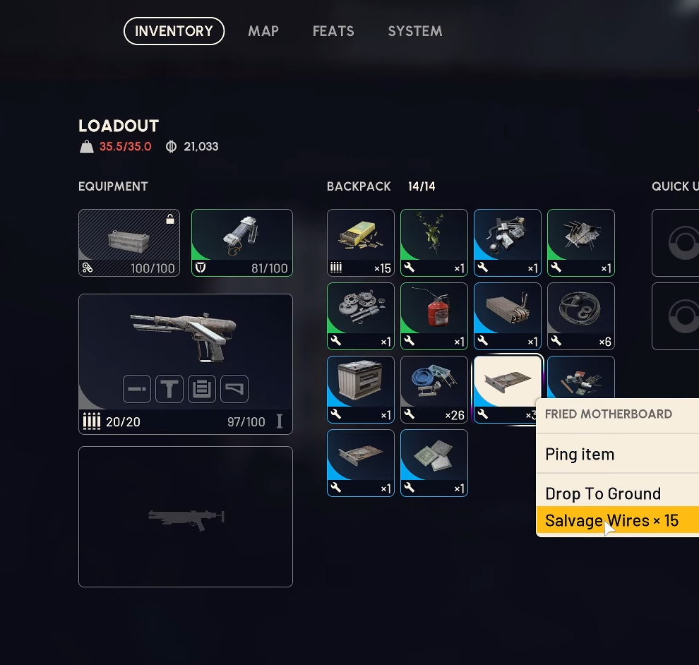 You don’t have to find wires as wires. Many electrical and mechanical pickups scrap down into them. In your inventory, select an item to preview its salvage output before you commit. Consistently useful categories include:
