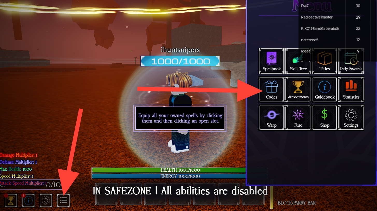 Step 2: Open the in‑game menu. Then, select 'Codes' button from the right-side of the screen.