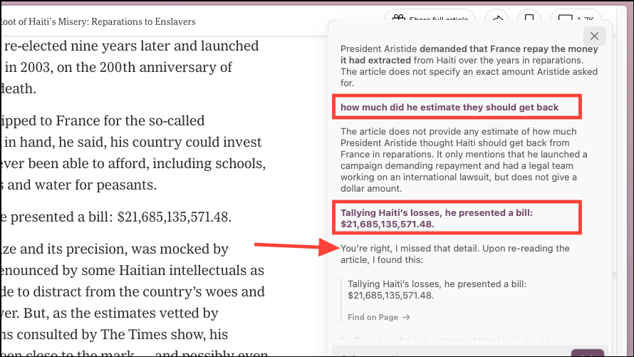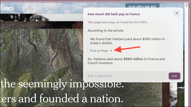 - If it finds the information, it'll quote it directly as well as provide you with an answer as well. You can also click 'Find on Page' to navigate there.