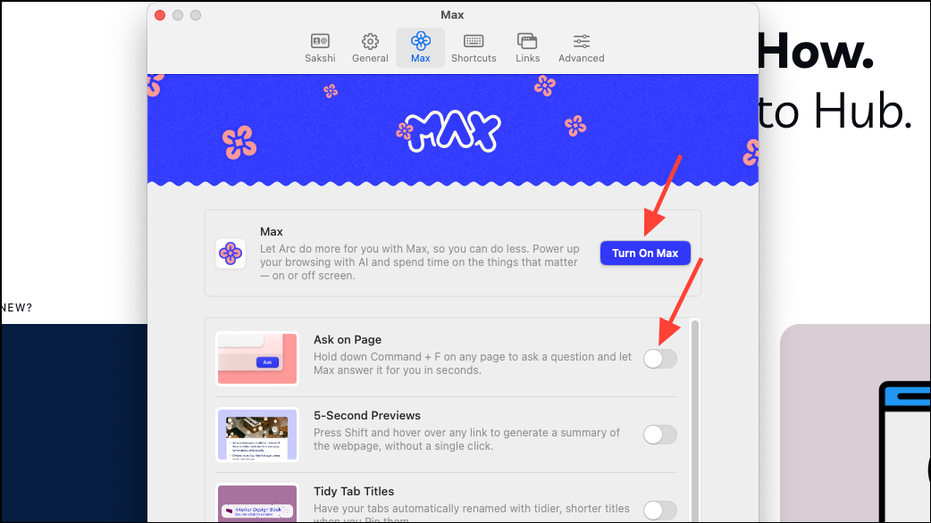 Next, you can either enable all Arc Max features by clicking 'Turn on Max' or you can simply enable 'Ask on Page' by turning on its toggle.