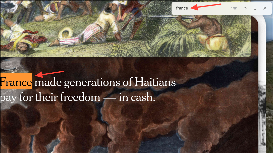 Type what you're looking for, and if it exists on the page, Arc will highlight it. You can then use the up and down arrows to move to other instances where the word/ phrase appears.