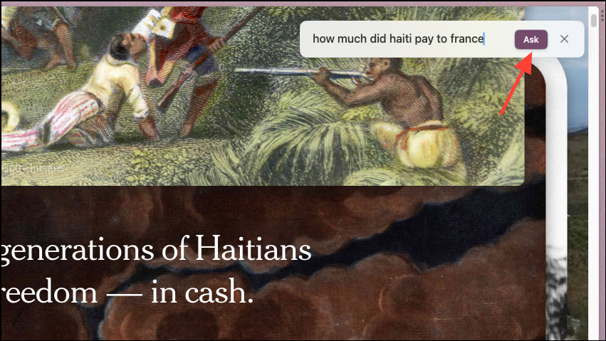 - But if it doesn't exist, an 'Ask' option will appear. You can type any question and send it to the AI by pressing 'Enter' or clicking on 'Ask', and it will read the content of the page and (try to) answer it.