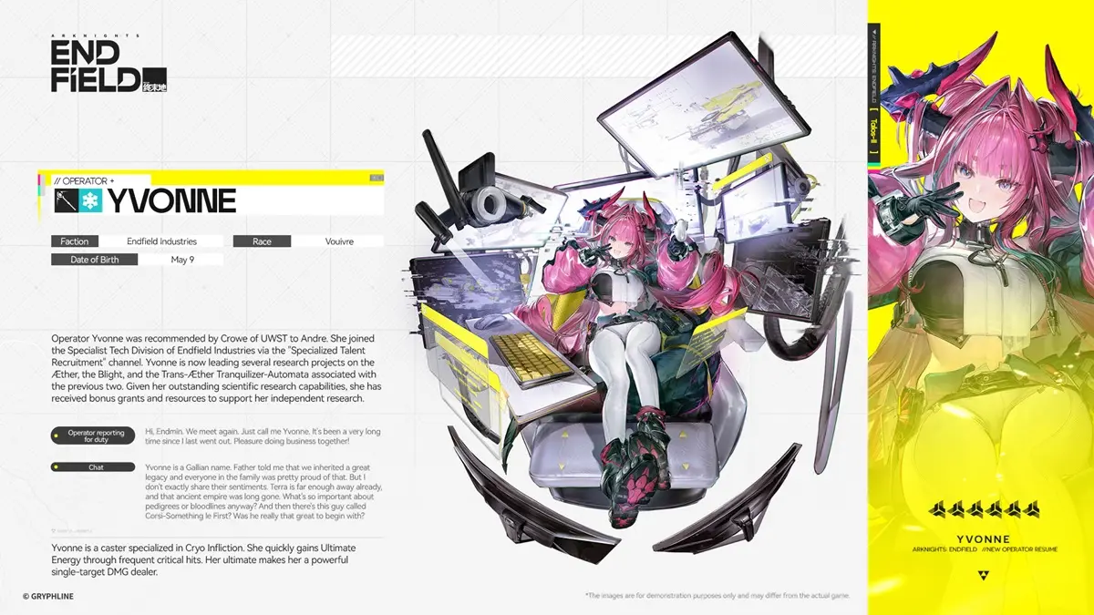 Yvonne is a Cryo Caster focused on high single‑target Arts damage with Cryo Infliction. She excels at deleting priority targets and bosses, and she brings minor crowd control through Solidification, which can stabilize fights by locking down dangerous enemies at key moments.
