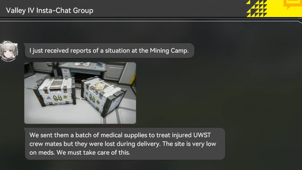 Part 1 becomes available after you read a specific message inside the Valley IV Insta-Chat Group. The message concerns a batch of medical supplies that went missing during delivery. You do not need to reach any particular main story checkpoint beyond having access to Origin Lodespring, but the Insta-Chat message must be opened before the quest marker appears on your map.