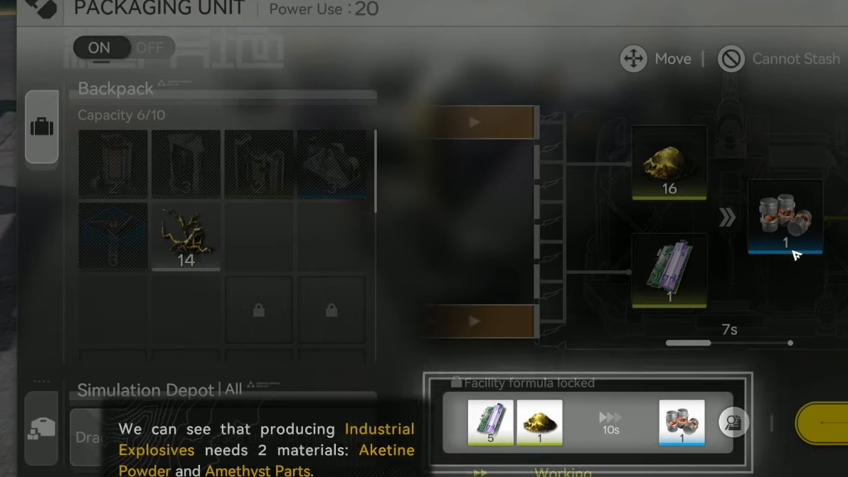 - Combine aketine powder and amethyst parts in the Packaging Unit to craft at least one Industrial Explosive.