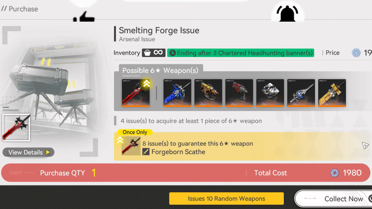 Pulls use Arsenal Tickets instead of the premium currency Oroberyl. A multi‑pull gives you ten random weapons at once; single pulls are not available on Arsenal Issues.