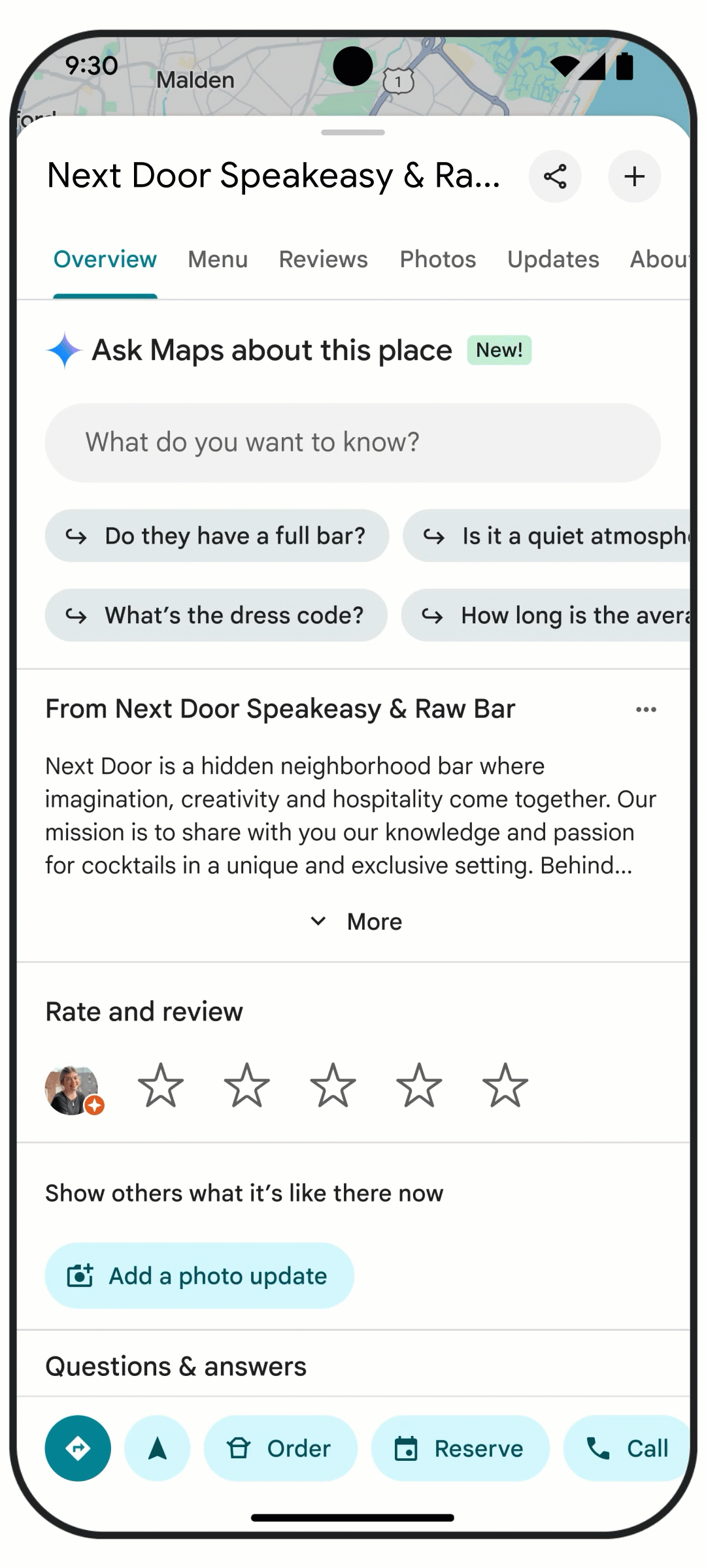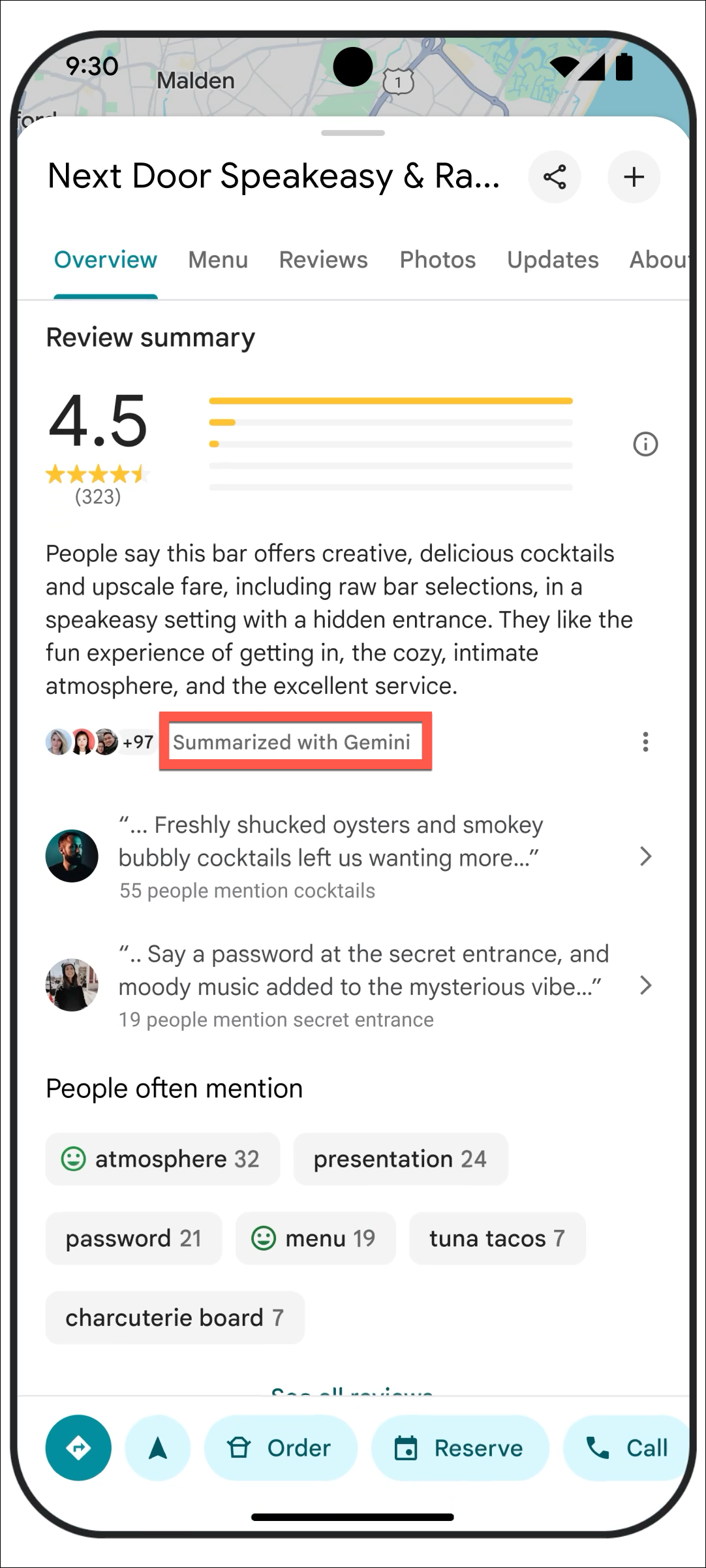 You can ask Gemini follow-up questions about a place like if you want to know what the atmosphere is like or whether it has outdoor seating. You can enter your own prompt in the 'Ask Gemini about this place' area or choose from some pre-defined options. Gemini will answer your question and also show the reviews it based its answer on so you can verify the information.