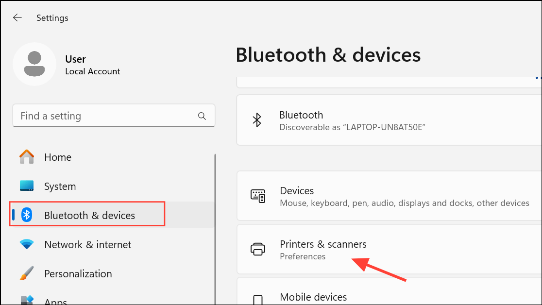 Step 2: On your Windows 11 PC, open the Start menu, then select Settings. Navigate to Bluetooth & devices and select Printers & scanners.