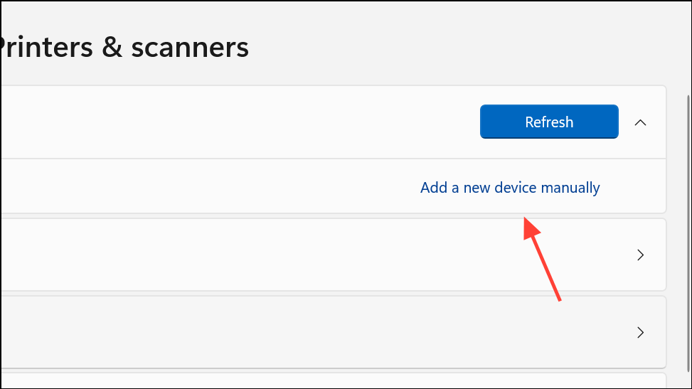 Step 2: On your Windows 11 PC, go to Settings > Bluetooth & devices > Printers & scanners and click Add device. Wait for the “Add manually” option to appear, then click it.