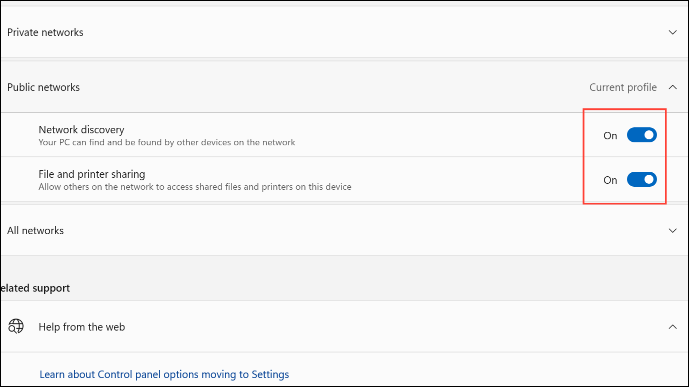 Step 2: Enable network discovery and printer sharing. In Settings > Network & internet > Advanced network settings > Advanced sharing settings, turn on both Network discovery and File and printer sharing for private networks.