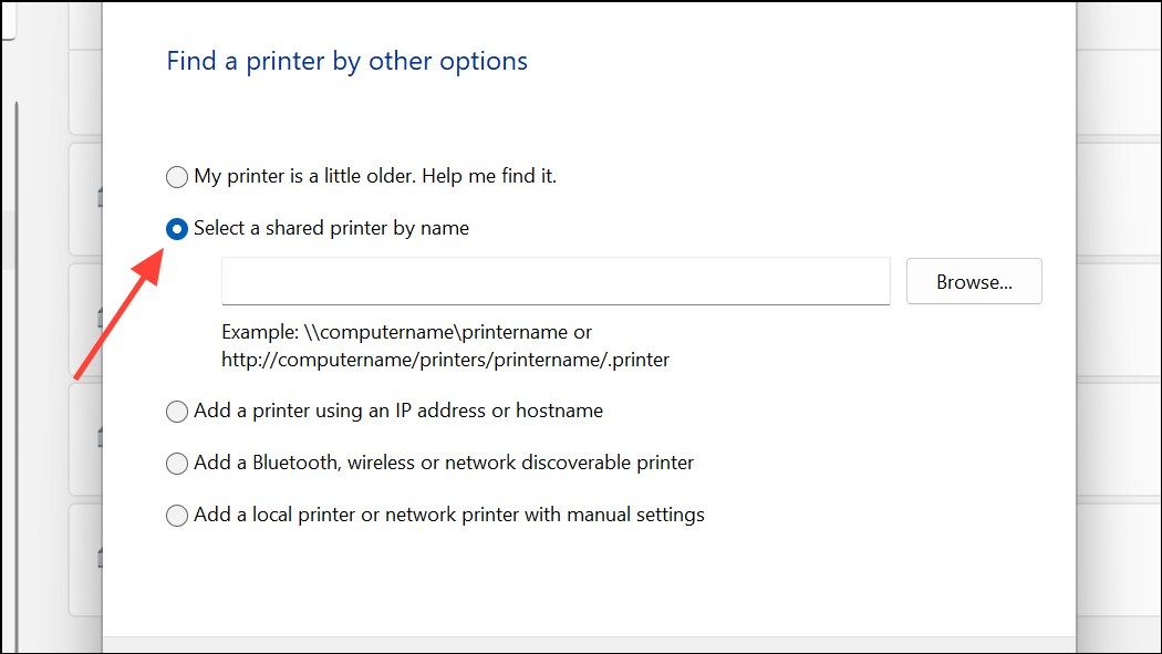 Step 4: On secondary PCs, add the shared printer from Printers & scanners by clicking Add device. If the printer isn’t listed, select Add manually, choose Select a shared printer by name, and enter the path using one of these formats:
