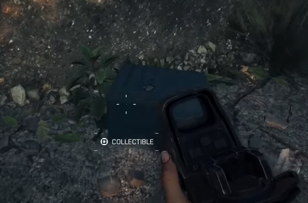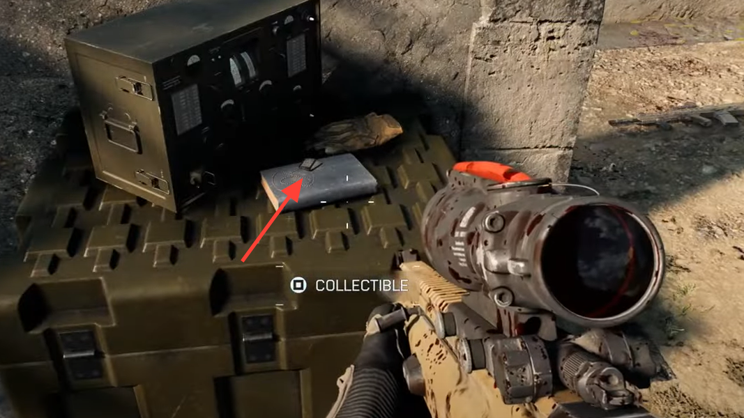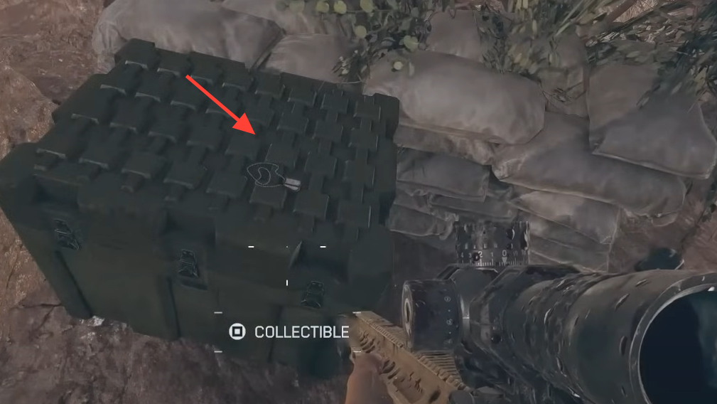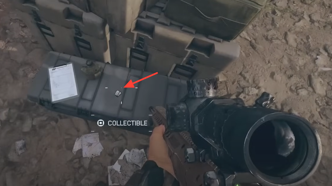 - Dog tag 1: After escaping the opening facility by vehicle, your squad dismounts near an overlook where a sniper team is waiting. Before crossing the low rock wall, check the cluster of ammo crates and gear to the left of the entry — the tag is on a crate.