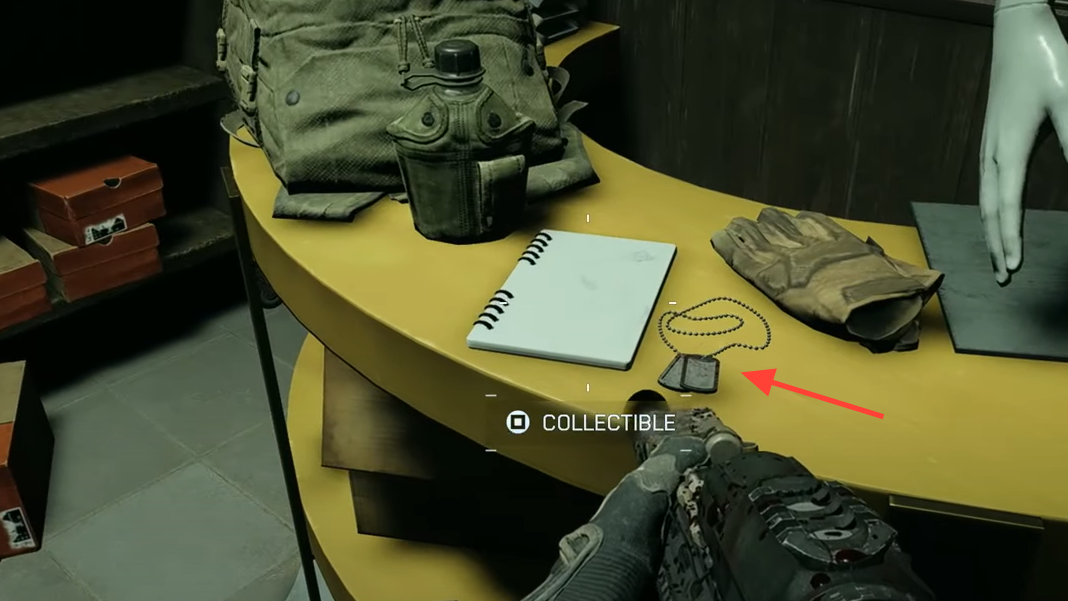 - Dog tag 1: In the underground gallery/tunnel where weapons are disabled, look for a large work table on the left under a flashing light — the tag is on that tabletop.