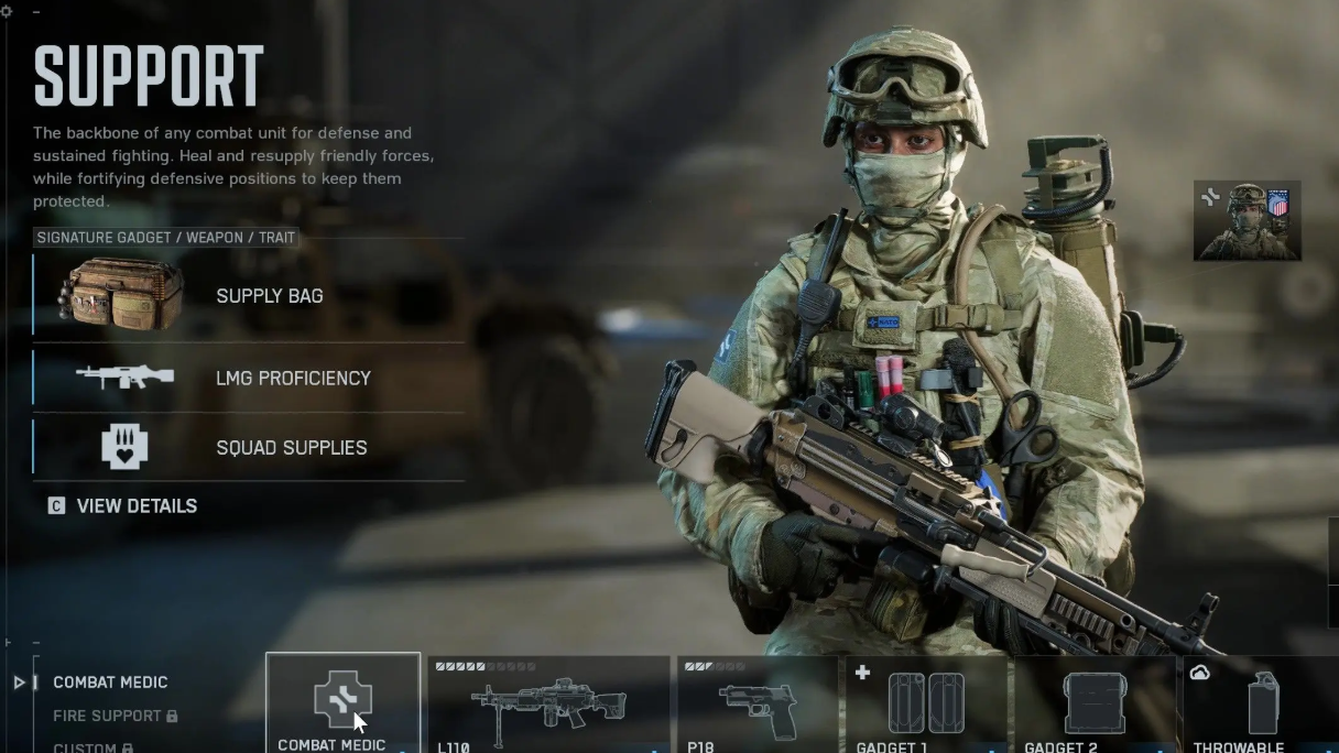 | 2 | Support | Revives fast, heals and resupplies, sustains fights | LMG proficiency, faster revive when stationary | Defibrillator, Supply Bag/Pouch, Smoke Launcher, Deployable Cover, Intercept System, Portable Mortar, Airburst Launcher |