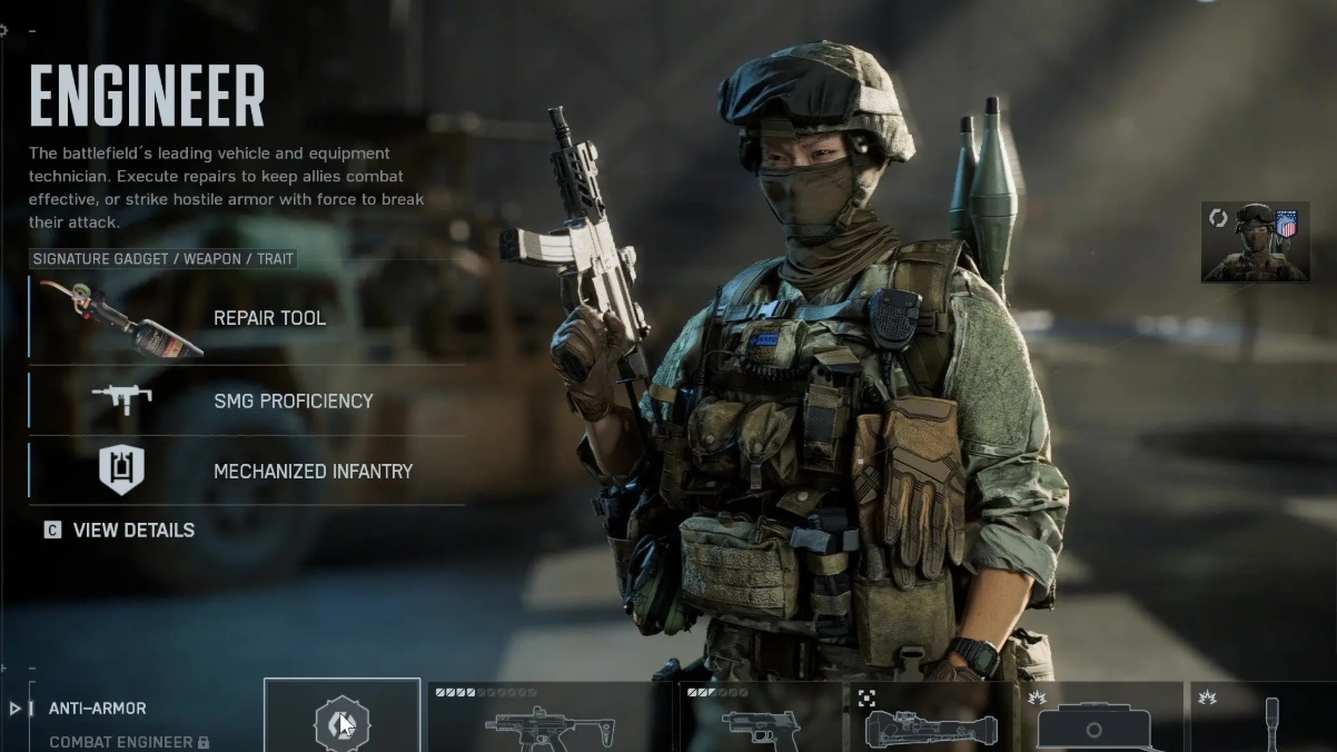 | 3 | Engineer | Repairs friendly armor, destroys enemy vehicles | SMG perks, explosive damage resistance | Repair Tool, Rocket Launchers, AV Grenade, AV Mine, EOD Bot, Acoustic Sensor AV Mine, Vehicle Supply Crate |