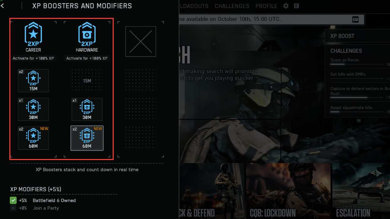 Beyond consumables, BF6 also layers small XP modifiers, such as bonus points for playing in a party and a minor “ownership” bonus. These stack on top of any active boosters.
