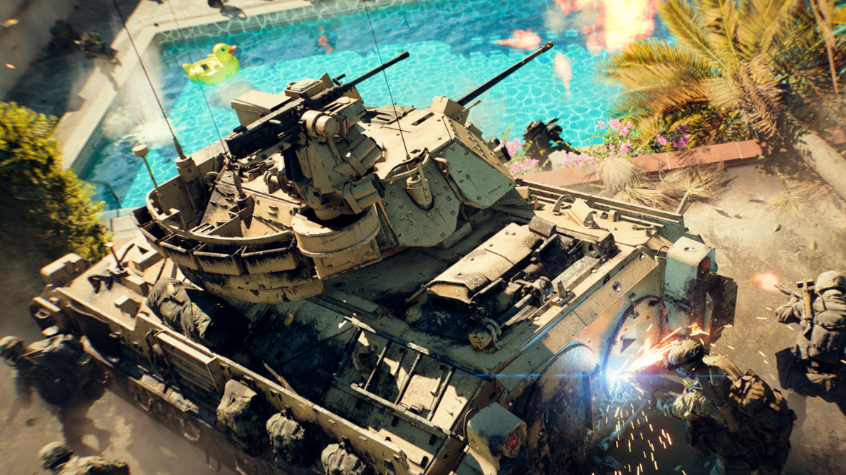 Eastwood shifts the fight to a Southern California suburb—an area of quiet streets, backyard pools, and a private golf course that’s now an active combat zone. The map is built to support all combat sizes and includes space for both infantry and vehicles, with lanes that move between dense residential blocks and open fairways.