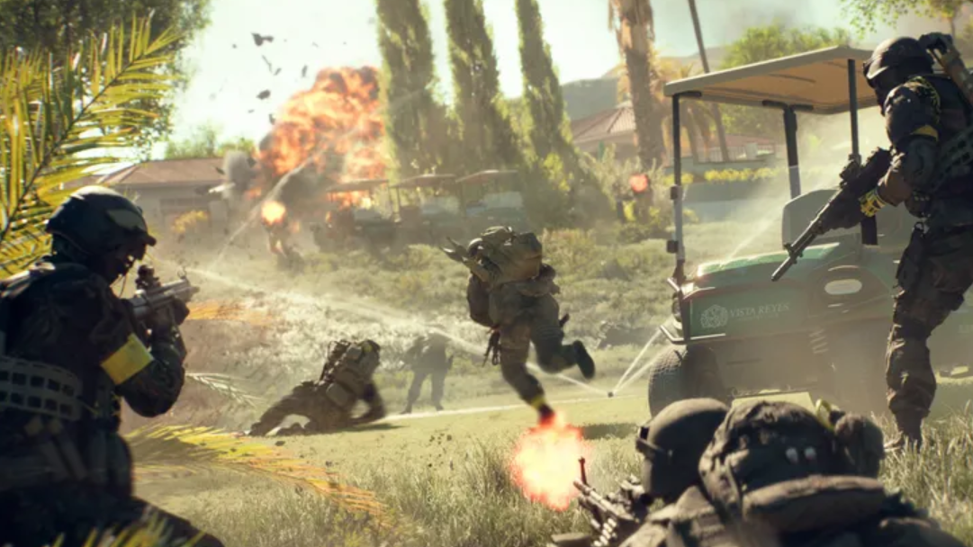 Expect a mix of close-quarters and long-range engagements. Street grids and single-family homes favor tight infantry fights through interiors and backyards, while the golf course opens into longer sightlines where ranged play and vehicle movement matter. The inclusion of helicopters and light utility like the golf cart gives squads more options to reposition between objectives.