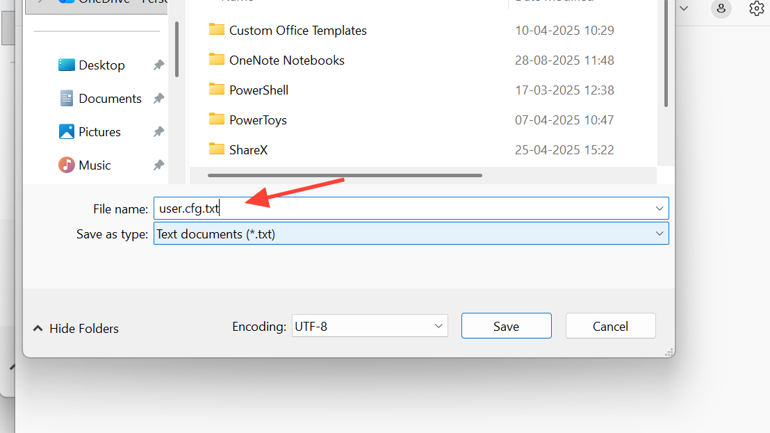 Step 2: Create a new text file and name it user.cfg (make sure it's not saved as user.cfg.txt — you may need to change the "Save as type" to "All files").