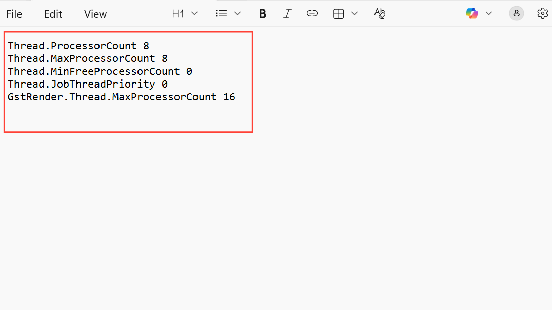 Step 3: Add the following lines, adjusting the numbers to match your CPU. The first two values should equal your physical core count, and GstRender.Thread.MaxProcessorCount should equal your total logical processors (threads).