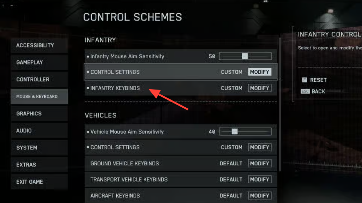 - For on-foot actions, open “Infantry Keybinds.” For vehicles and aircraft, open the vehicle keybinds and control sections just below.