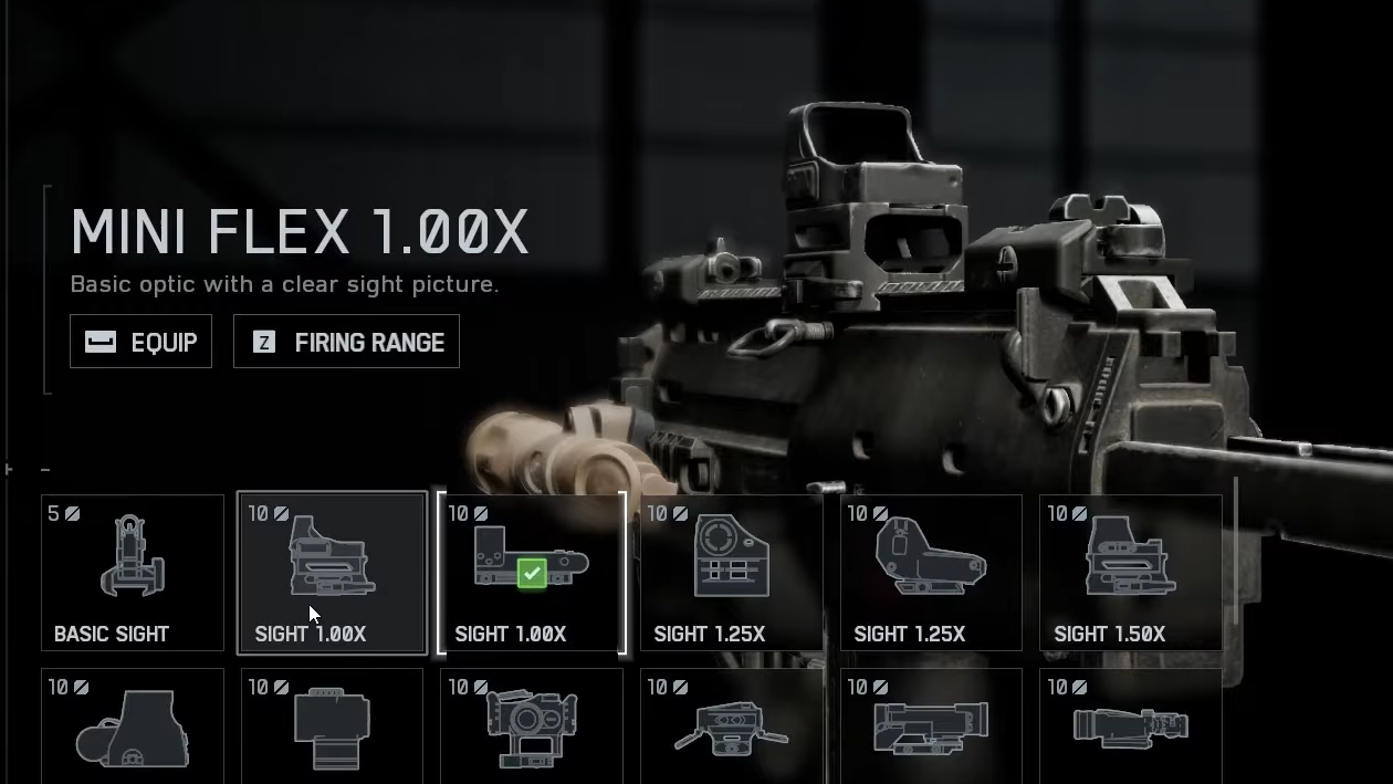 | Optic | Mini Flex 1.00x | 10 | Clean sight picture for snap shots in CQC. |