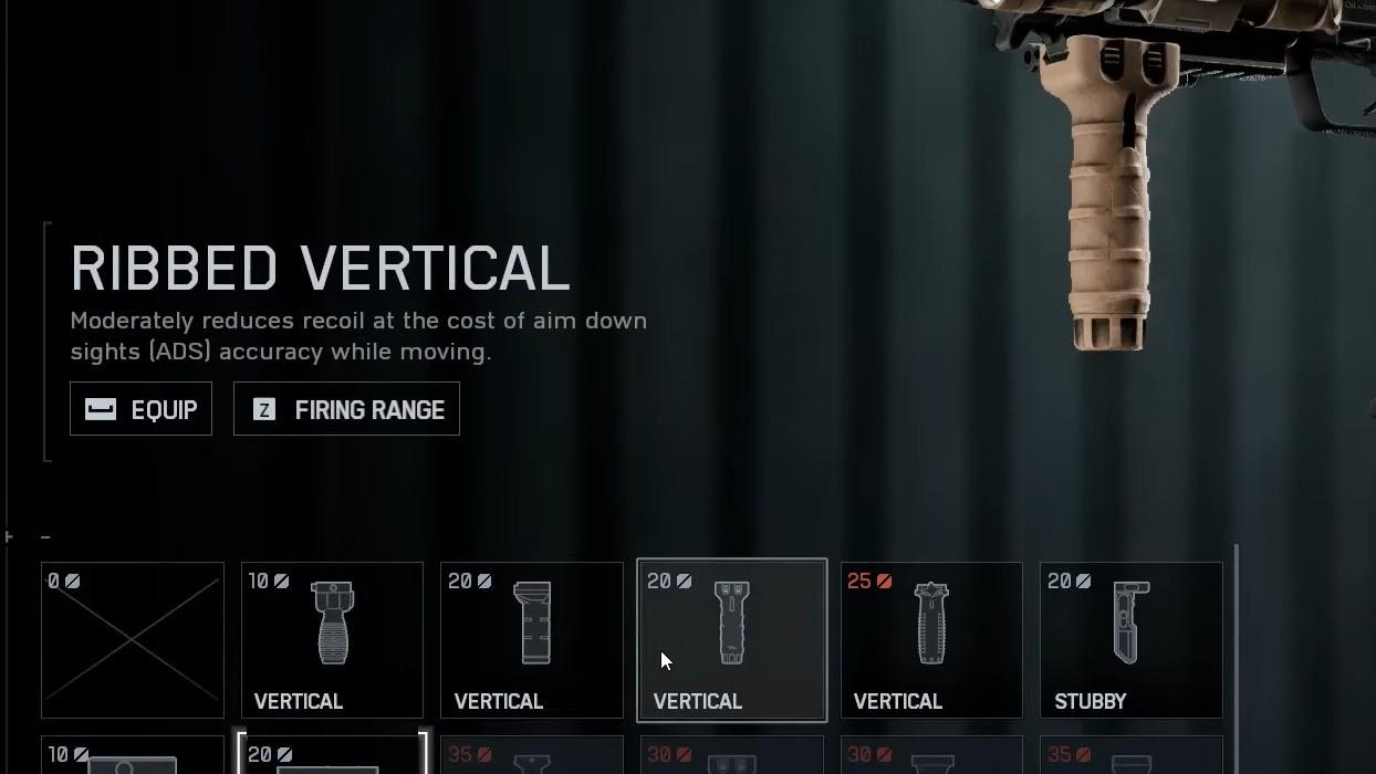 | Underbarrel | Slim Angled | 20 | Lower initial kick and faster ADS transition. |