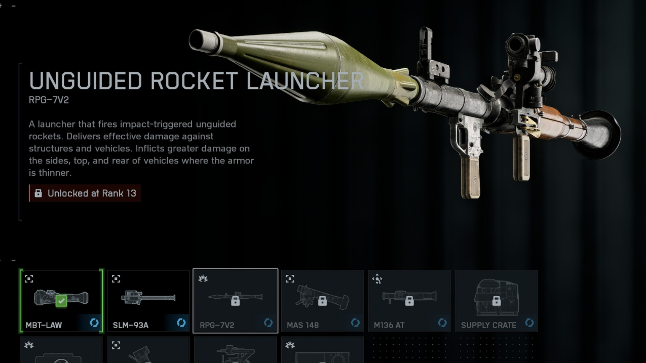 - Gadget 1: RPG‑7V2 for reactive anti‑vehicle pressure.
