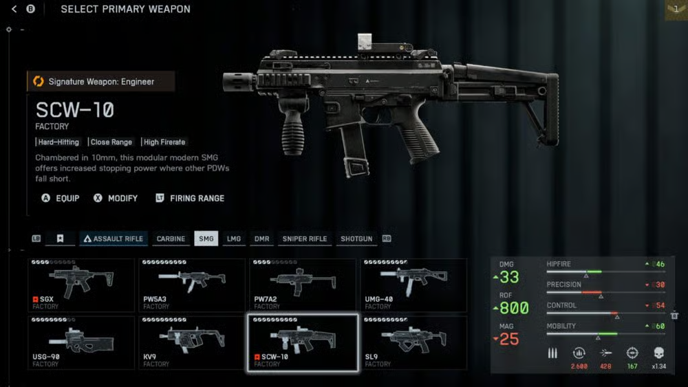 The SCW‑10 is built for sprint‑in, shoot‑first fights. Styled after the Kriss Vector, it marries a very high rate of fire with heavy per‑shot damage and a small magazine. That makes it unforgiving if you whiff, but devastating when you commit to close‑range engagements. The build below leans into that identity with fast aim‑down‑sight (ADS) speed, tight hipfire, and just enough recoil control to stay on target — all within a 100‑point budget you can realistically complete by around Mastery 20.