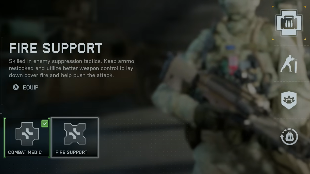 Fire Support emphasizes steadier weapon handling from a mounted position, faster ammo resupply, and better resistance to explosive damage—ideal for holding lanes and supporting pushes.
