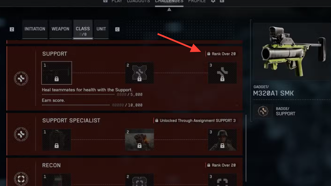 The Support track in Battlefield 6 unlocks in two phases and pays out some of the class’s most useful gadgets. First, reach player Rank 20 to enable Class Challenges. Complete the three base Support challenges to unlock a second, “Specialist” track with three more objectives. Finish all six and you’ll walk away with core tools like the smoke launcher and Supply Pouch, plus cosmetics tied to the role.