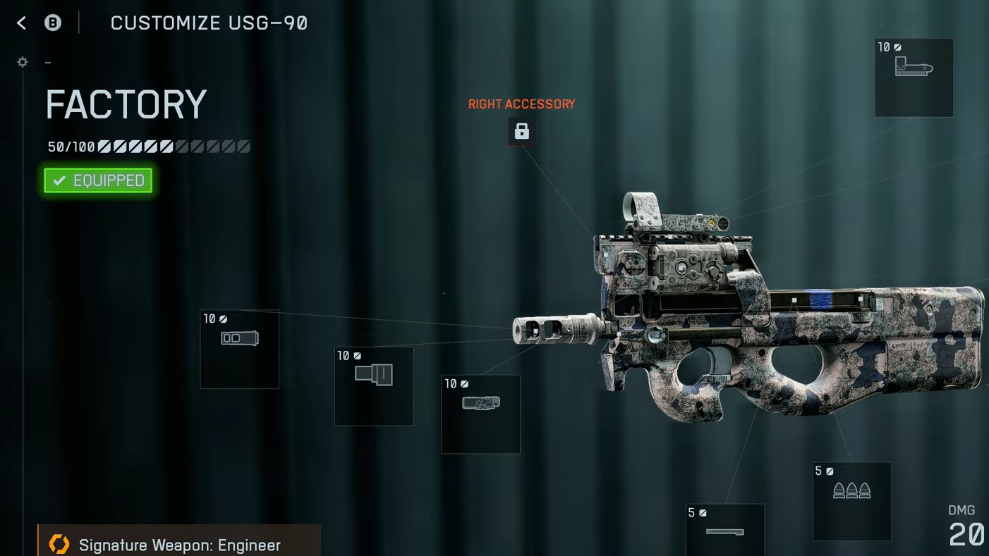 | USG-90 | Hip-fire room clearer | Muzzle: Double‑Port Brake • Barrel: 264MM Prototype • Left Accessory: 5 MW Green • Ergonomics: Mag Catch • Optic: OSA‑7 1.00x |