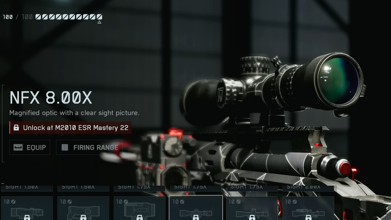 | M2010 ESR | Fast travel opener | Muzzle: Lightened Suppressor • Barrel: 26" Carbon • Left Accessory: Range Finder • Magazine: 5 RND • Ammunition: Long‑Range • Scope: S‑VPS 6.00x • Optic Accessory: Canted Reflex |