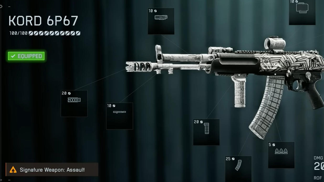 KORD 6P67 — Run a Long Suppressor or Double‑Port Brake, 415mm Prototype barrel, 6H64 Vertical grip, 40‑round mag, and a simple 1.0–2.0x optic. With Redsec’s lower recoil, this setup deletes armored targets quickly without giving away position.