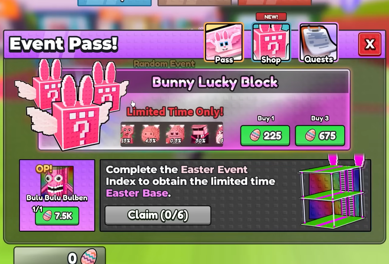 The Bunny Lucky Block drops from the Easter Pass at levels 2, 5, and 8 on both the Free and Premium reward tracks. If you don't want to level up the pass at all, head to the Event Pass Shop — one Bunny Lucky Block costs 225 Easter Eggs, and a three-pack costs 675 Easter Eggs. There's no purchase limit as long as you have the currency.