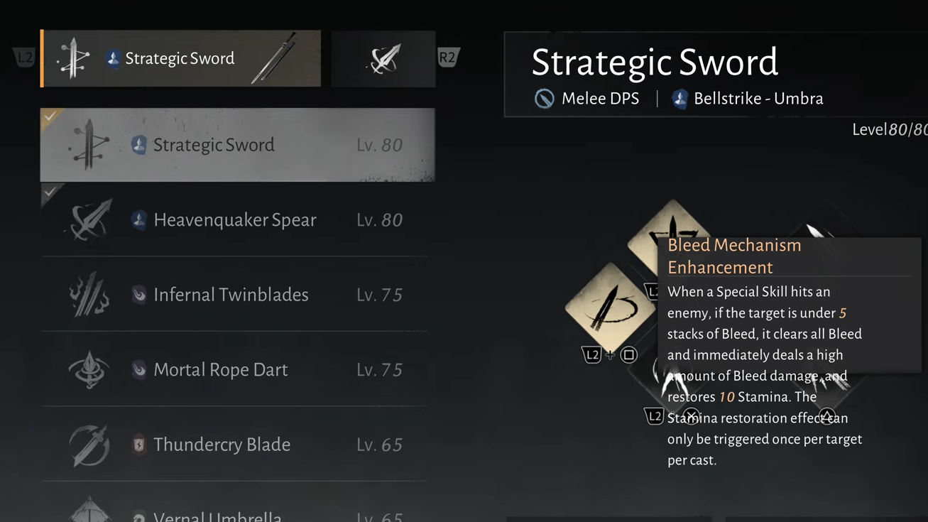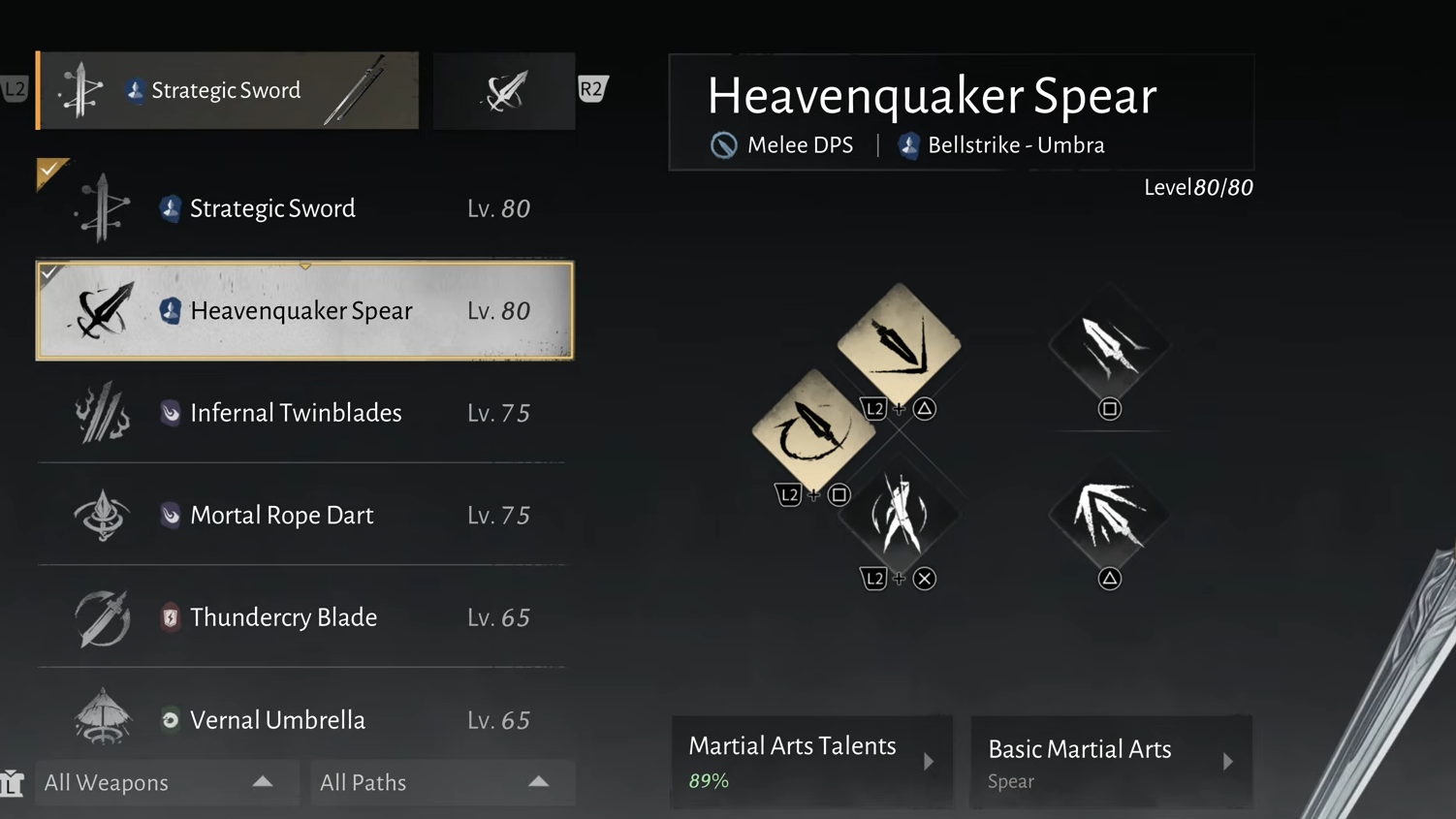 Bellstrike Umbra focuses on applying bleed status effects to trigger frequent damage ticks, then increasing your own damage multiplier to eliminate targets faster. The build retains decent mobility but trades control and survivability for raw DPS. Your primary weapons are the Strategic Sword and Heavenquaker Spear, both following the Bellstrike Umbra path.