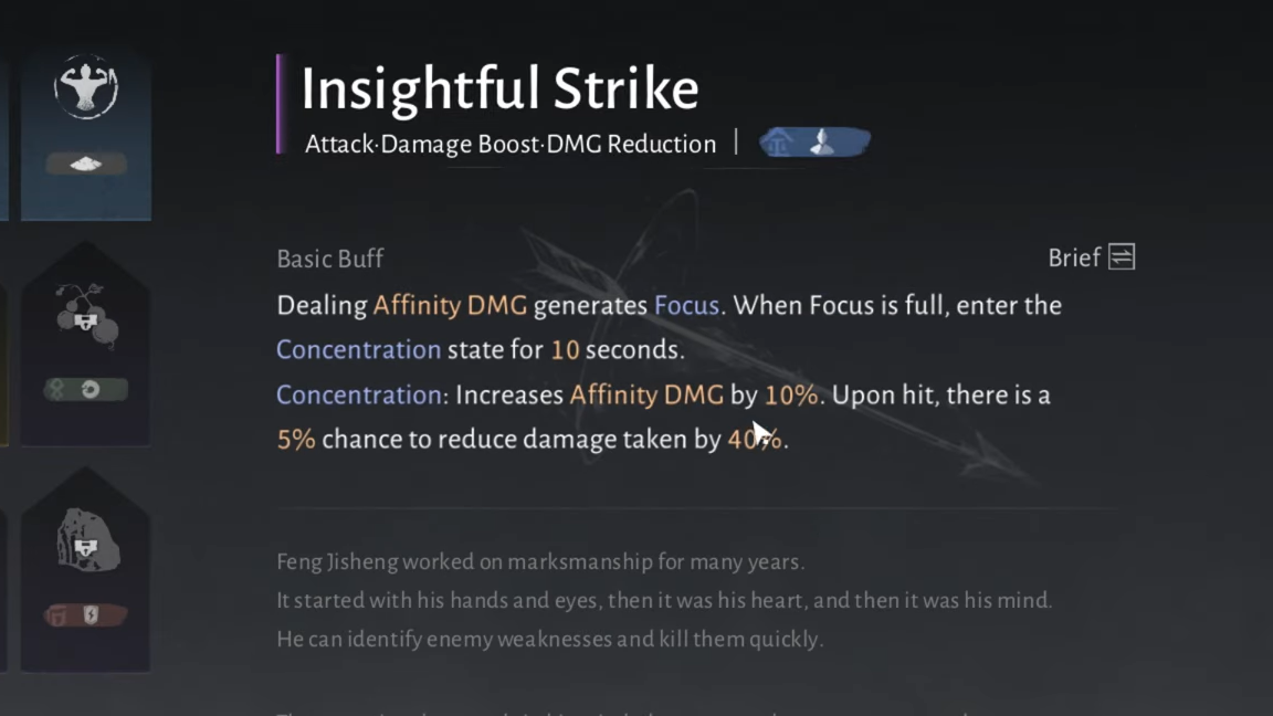 Insightful Strike (Tier 2) generates Focus when dealing Affinity DMG, entering a Concentration state that increases Affinity DMG by 10% and reduces damage taken. Tier 3 increases Affinity Rate by 3% while in Concentration. Fivefold Bleed (Tier 4) adds a 10% chance to apply Weeping Blood DoT, which deals piercing damage at 5 stacks. Bitter Seasons (Tier 3) has a 10% chance to apply Poison, reducing the target's Physical Defense by 1.2% for 10 seconds, stacking up to 5 times. These are situational and less commonly used than the core four.