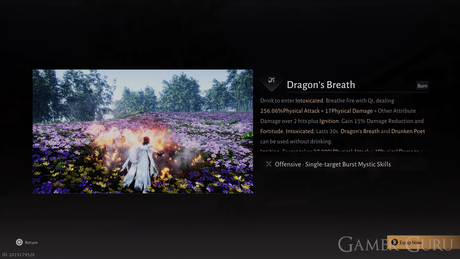 Dragon's Breath (Tier 4): Drink to enter Intoxicated. Breathe fire with Qi, dealing damage over 2 hits plus Ignition. Gain 7.5% Damage Reduction and Fortitude. Intoxicated lasts 30 seconds, and Dragon's Breath can be used without drinking once Intoxicated. Ignition causes the target to take damage every 0.5 seconds for 8 seconds. Use Dragon's Breath after Heavenquaker Spear's charged attack to apply burn, then animation-cancel with parry once the skill hits the enemy.